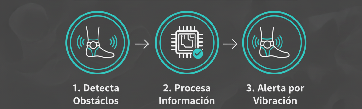 En el corazón de la tobillera se encuentran sensores avanzados que realizan mediciones en tiempo real, evaluando parámetros como la distancia y la presencia de objetos a nivel del suelo. Una vez detectado un obstáculo (como un bordillo, escalón, objeto bajo o desnivel), el sistema procesa instantáneamente esta información para determinar su relevancia y proximidad. Acto seguido, la tobillera alerta al usuario mediante patrones específicos de vibración o sonido, permitiéndole reaccionar de manera oportuna y segura, adaptando su paso o dirección para evitar posibles accidentes.